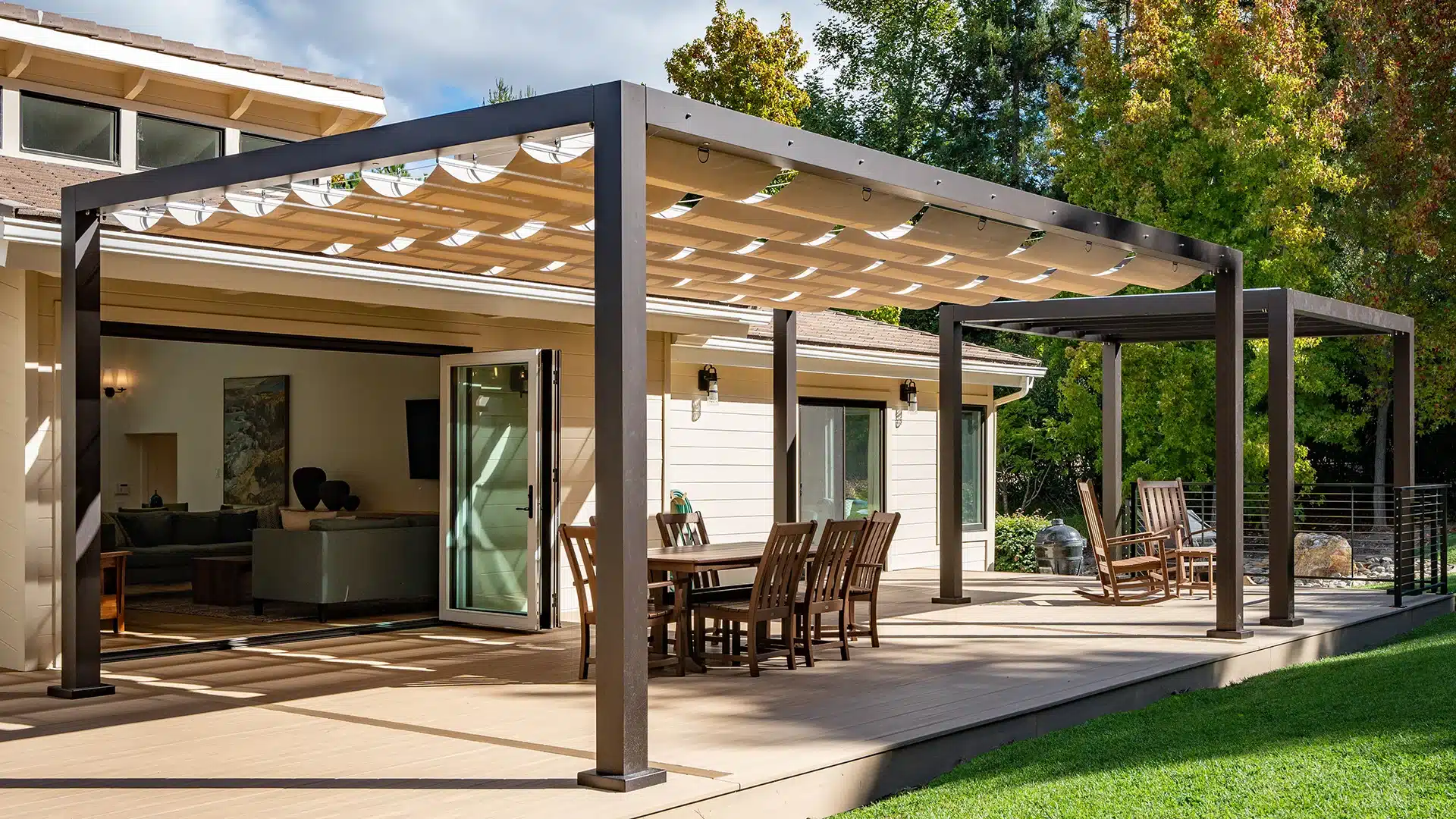 Open-concept homes have changed how homeowners use space. Large sliding or folding glass doors blur the line between the kitchen, dining room, and backyard. Modern pergola ideas take that concept and apply it to the outdoors. They blend the indoor/outdoor line to create seamless indoor/outdoor living.